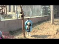 20140304_月亮産室_夢夢 明明_飼育員が夢夢を抱いて、木に登らせようとするが、明明に蹴飛ばされた。二人は草地で転がって喧嘩する。